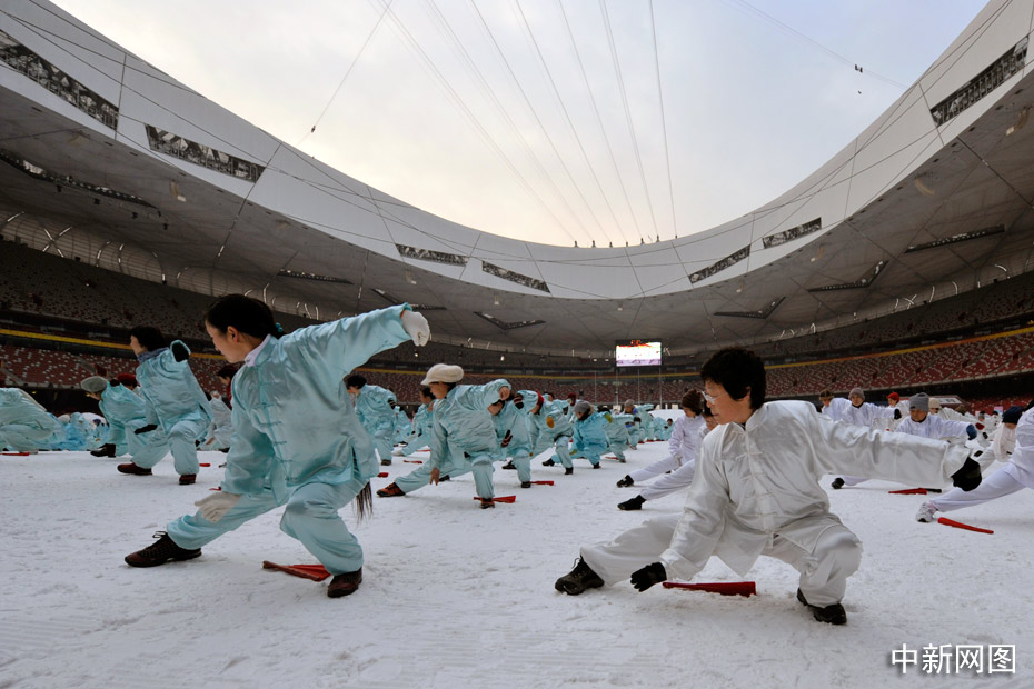 2010年1月1日上午,2010人在被冰雪覆蓋的鳥巢內(nèi)表演了太極拳、武功扇等民族傳統(tǒng)健身項目。中新網(wǎng)記者 金碩 攝