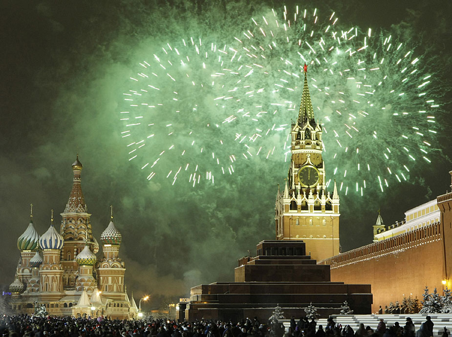 圖為2010年1月1日,俄羅斯首都莫斯科紅場上舉行了煙花表演。