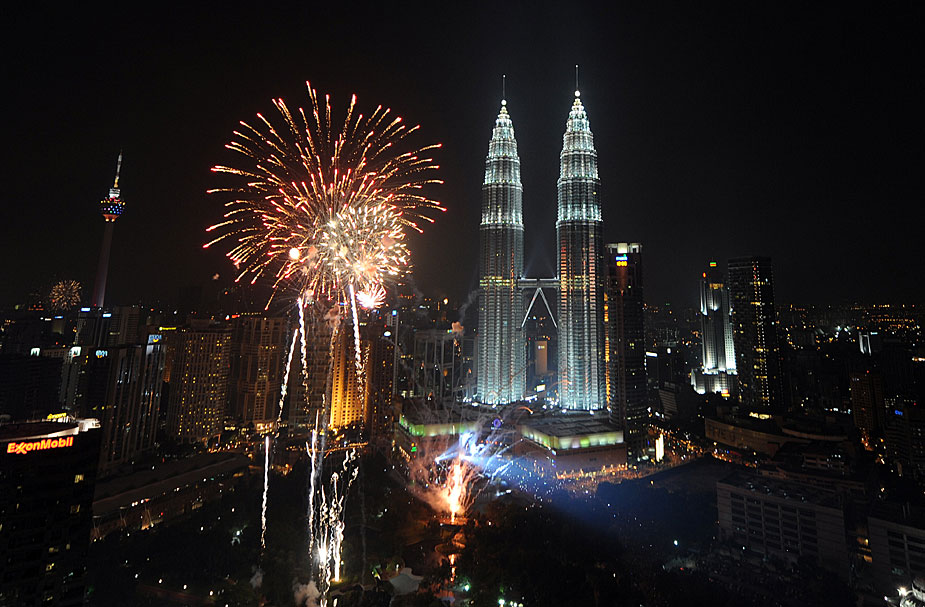 圖為2010年1月1日,馬來西亞吉隆坡的雙子星大廈前,煙花璀璨。