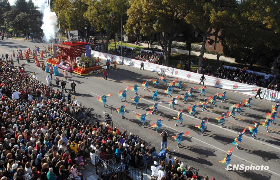 美國當(dāng)?shù)貢r(shí)間1月1日,第121屆美國玫瑰花車大游行在加州帕薩迪納市隆重舉行。著名影星成龍助陣中國上海世博花車。圖片來源:中國新聞網(wǎng)