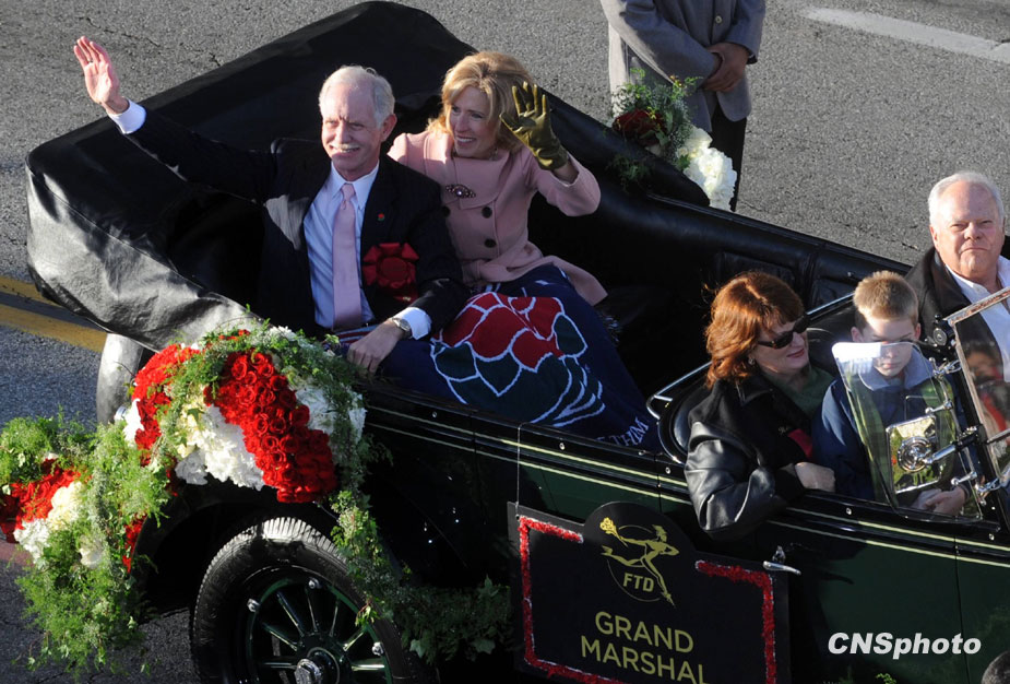 美國當(dāng)?shù)貢r間1月1日,第121屆美國玫瑰花車大游行在加州帕薩迪納市隆重舉行。著名影星成龍助陣中國上海世博花車。圖片來源:中國新聞網(wǎng)