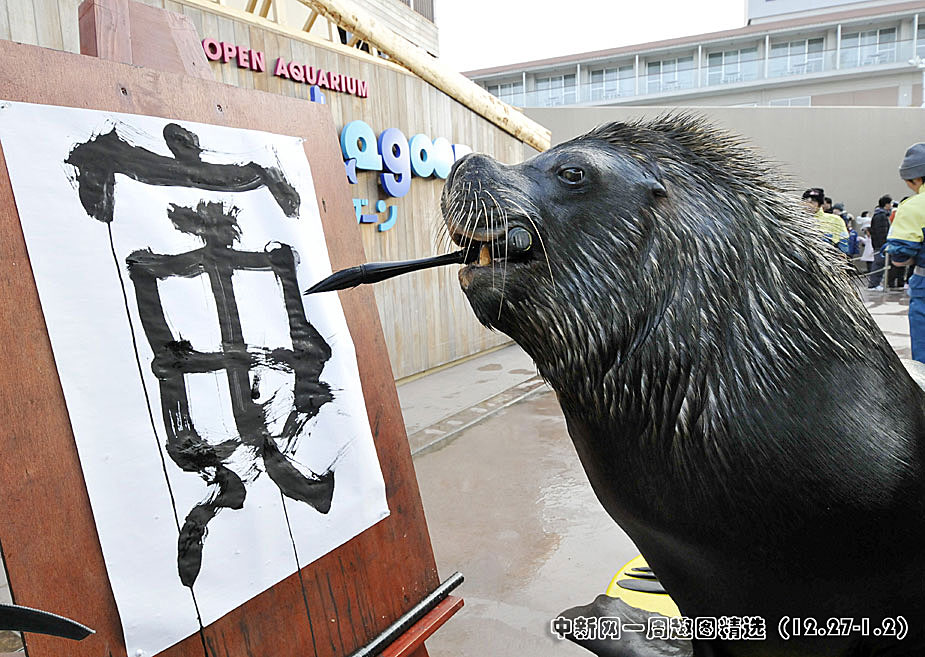 12月30日,日本神奈川八景島海洋樂園水族館內(nèi),海獅表演了用毛筆在紙上“寫”漢字的節(jié)目。圖片來源:中國新聞網(wǎng)>>點(diǎn)擊觀看詳細(xì)內(nèi)容