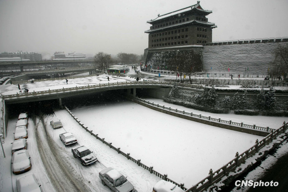 大雪中的德勝門更加美麗。中新社發(fā) 富田 攝