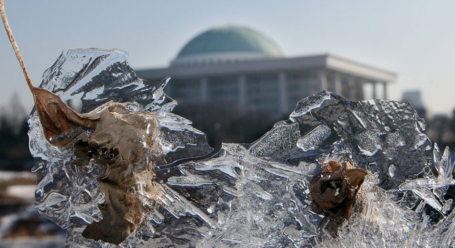 1月3日,首爾,天氣寒冷,隔著冰柱看到的韓國(guó)國(guó)會(huì)大廈。
