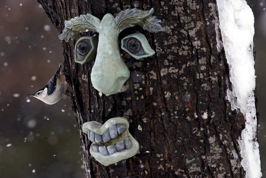 1月3日,加拿大弗雷德里克頓附近,一只白胸市鳥在一棵裝飾成人臉的樹上休息。