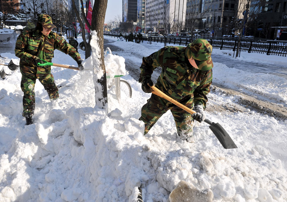 四日,韓國(guó)大部分地區(qū)遭遇大雪。至下午二時(shí)左右,首爾地區(qū)積雪厚度超過二十八厘米,這是韓國(guó)自一九三七年開始進(jìn)行積雪量觀測(cè)以來的最新紀(jì)錄。圖為1月5日,韓國(guó)士兵在街頭除雪。