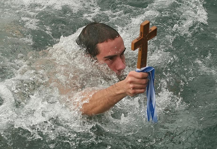 1月6日,在保加利亞卡洛菲爾市,人們在冰冷的河水中跳起保加利亞民間舞蹈霍洛舞,相互祝福在新的一年里身體健康,事事順?biāo)臁D片來源:中國新聞網(wǎng)