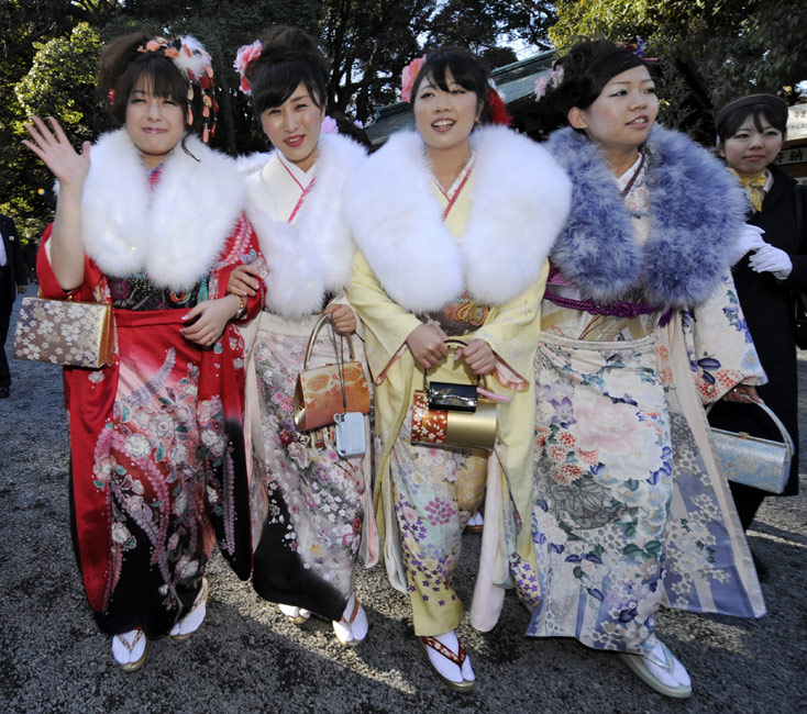 今年的1月11日,是日本傳統(tǒng)的成人節(jié),所有滿20歲的年輕人將宣告自己邁進(jìn)了成人行列。1月8日,日本一家公司年滿20歲的年輕女孩紛紛穿上和服,到廟宇中祈福,提前慶祝成人節(jié)的到來(lái)。