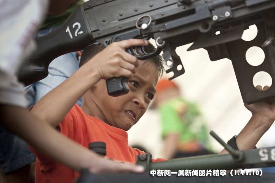 1月9日(周六),當天是泰國的兒童節(jié),一名男孩正在體驗沒有裝彈的機槍。圖片來源:中國新聞網(wǎng)