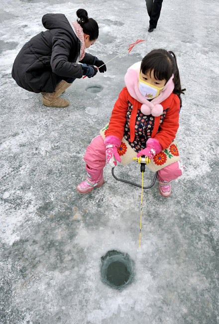 2010年1月9日,韓國華川郡,一年一度的華川山鱒魚節(jié)當(dāng)日舉行。數(shù)千游客在此“破冰”比賽釣鱘魚。該活動(dòng)每年都會(huì)吸引上百萬游客前來。
