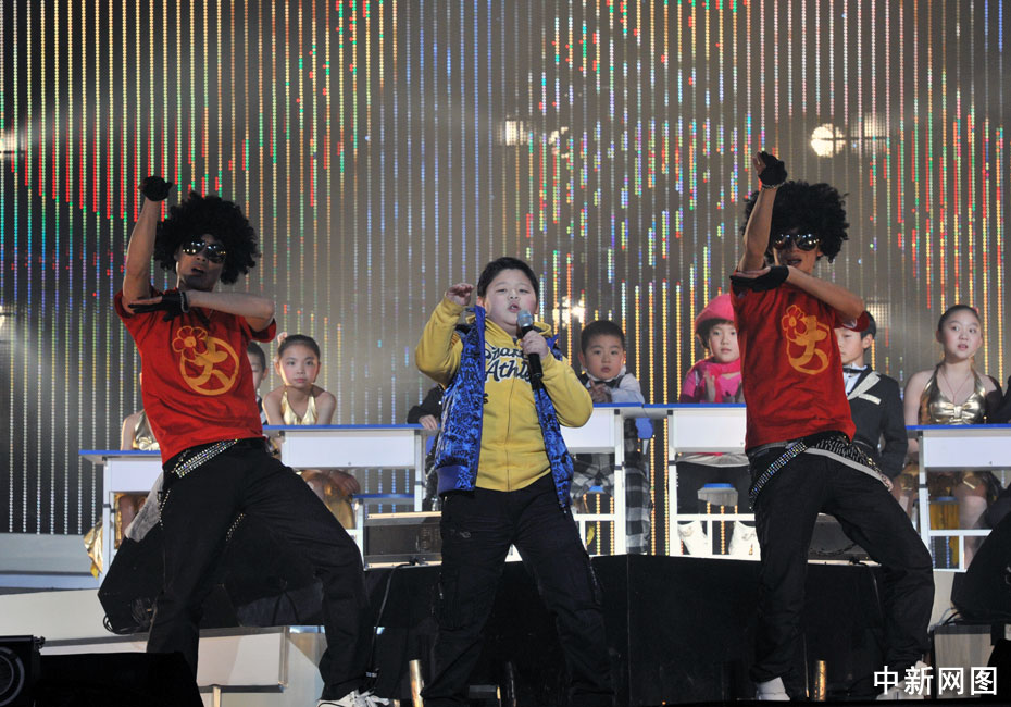 1月11日晚,第二屆音樂風(fēng)云榜新人盛典在京舉行,盛典現(xiàn)場的音樂課上,兒童版的Wonder Girl、Super Junior、邁克爾·杰克遜、曾軼可、大張偉紛紛登臺獻藝,讓現(xiàn)場觀眾們笑聲不斷。中新網(wǎng)記者 金碩 攝