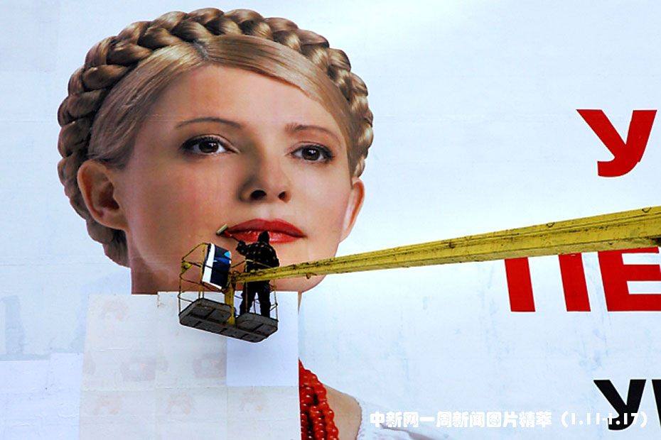 1月14日(周四),一名工人在基輔張貼烏克蘭總理季莫申科(Yulia Tymoshenko)的巨幅海報。她向選民承諾若當選總統(tǒng),將修復(fù)烏克蘭與俄羅斯的關(guān)系。投票從本周日開始。圖片來源:中國新聞網(wǎng)