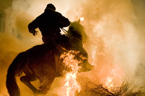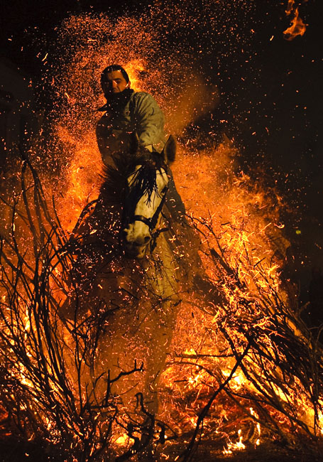 1月16日,西班牙一小村莊舉行一年一度的圣安東尼贖罪節(jié),勇敢的騎士們騎上心愛的坐騎穿過熊熊燃燒的火堆。 圖片來源:中國新聞網(wǎng)