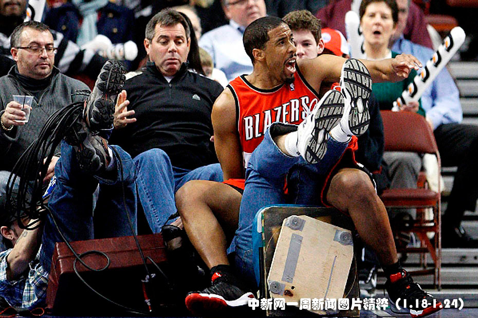 1月20日,波特蘭開創(chuàng)者隊(duì)后衛(wèi)米勒在客場對陣費(fèi)城76人隊(duì)的比賽中搶球撞上場邊的電視臺工作人員。波特蘭開創(chuàng)者最終以98比90擊敗費(fèi)城76人隊(duì)。圖片來源:中國新聞網(wǎng)