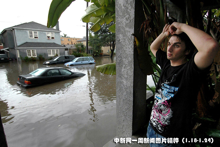 1月19日,羅杰斯在雨水涌進(jìn)家中之后在鄰居的門廊下躲避。因另一場太平洋暴風(fēng)雨在向美國南加州地區(qū)逼近,迫使數(shù)百名居民撤離。圖片來源:中國新聞網(wǎng)