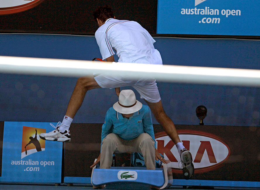在澳網(wǎng)男子四分之一決賽上,克羅地亞選手西里奇(Marin Cilic)在對陣美國選手羅迪克(Andy Roddick)時為救球從邊裁頭頂跳過。
