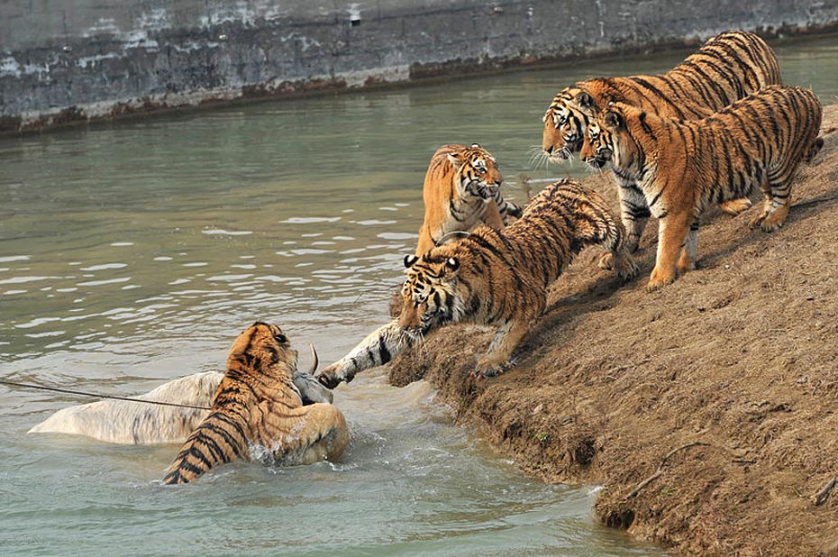 但水中的牦牛一動彈,更加激發(fā)了老虎的野性,這時有三、四只老虎撲了上來,工作人員拼命往水塘邊上拽牦牛,無奈一只虎王一下就咬住了牦牛的脖子怎么都不肯松口,繼而上演了人和老虎的“拔河比賽”。