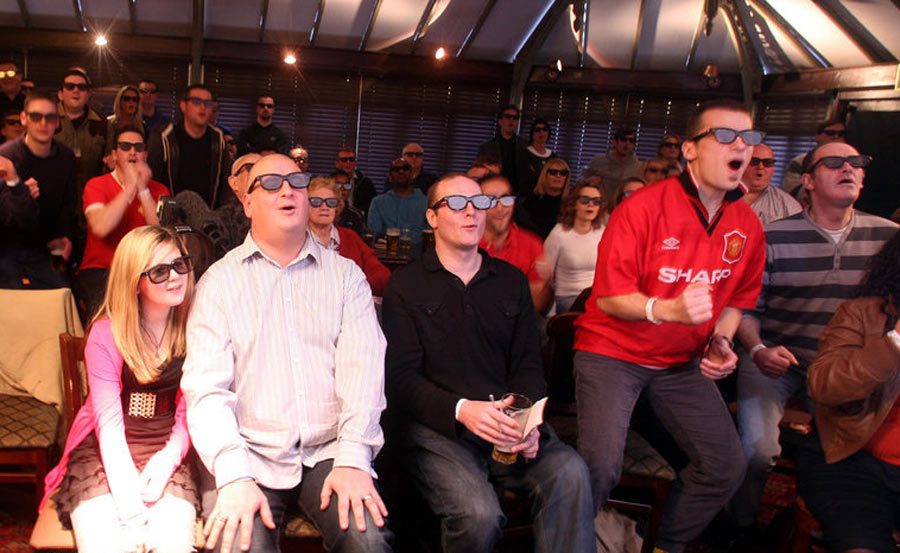 英國曼徹斯特,09/10英超第24輪,阿森納Vs曼聯(lián),曼聯(lián)球迷觀看3D直播。北京時間2月1日,英國體育頻道首次使用3D技術(shù)對阿森納與曼聯(lián)的比賽進(jìn)行電視直播。據(jù)悉,今年南非世界杯也將進(jìn)行3D轉(zhuǎn)播。