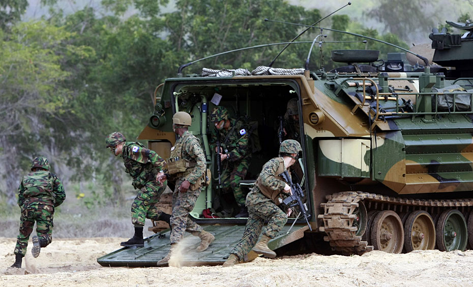 2月4日,參加“金色眼鏡蛇”聯(lián)合軍演的各國軍隊(duì),在泰國的Rayong省沙灘進(jìn)行了兩棲登陸演練。本次聯(lián)合軍演共有來自泰國、美國、印度尼西亞、新加坡、日本、韓國的約1.4萬名軍人參加。圖片來源:中國新聞網(wǎng)