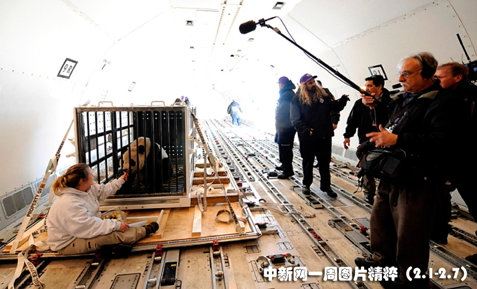 2月4日(周四),大熊貓?zhí)┥奖凰蜕县洐C,從美國佛吉尼亞州尚蒂爾市啟程返回中國。圖為飼養(yǎng)員妮可.-米斯(Nicole-Meese)在機艙里為泰山喂食。圖片來源:中國新聞網(wǎng)