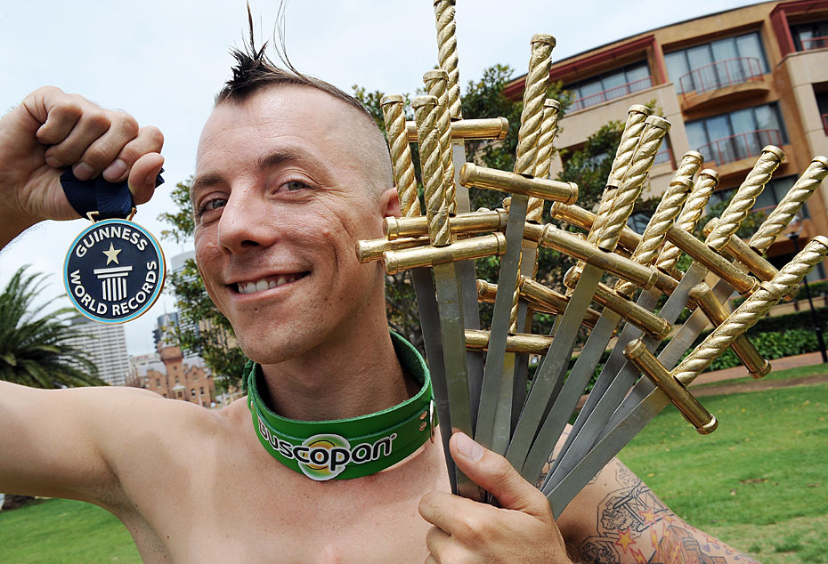 2月8日,街頭藝人Chayne Hultgren在澳大利亞悉尼海港大橋前,一次吞下18把厚約1.3厘米,長約50.8厘米的長劍,刷新了吉尼斯世界紀(jì)錄。圖片來源:中國新聞網(wǎng)