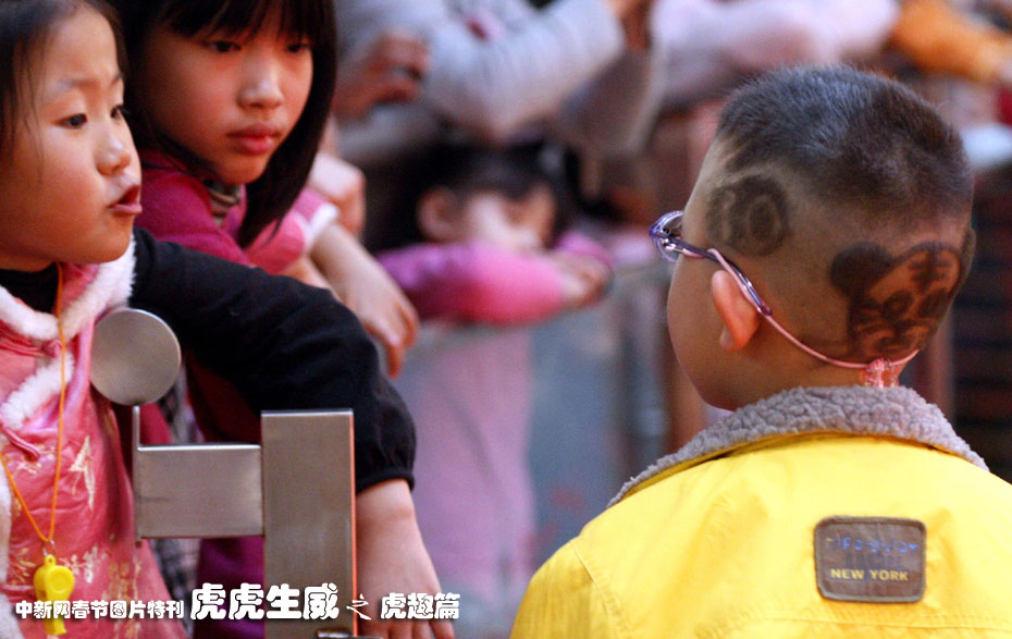 中國傳統(tǒng)新年虎年將至,北京隨處可見以虎為主題的各種雕塑、繪畫以及裝飾、禮品。圖為近日北京一名小朋友以最新潮的“小老虎頭”亮相顯得別具新意。中新社發(fā) 錢興強(qiáng) 攝
