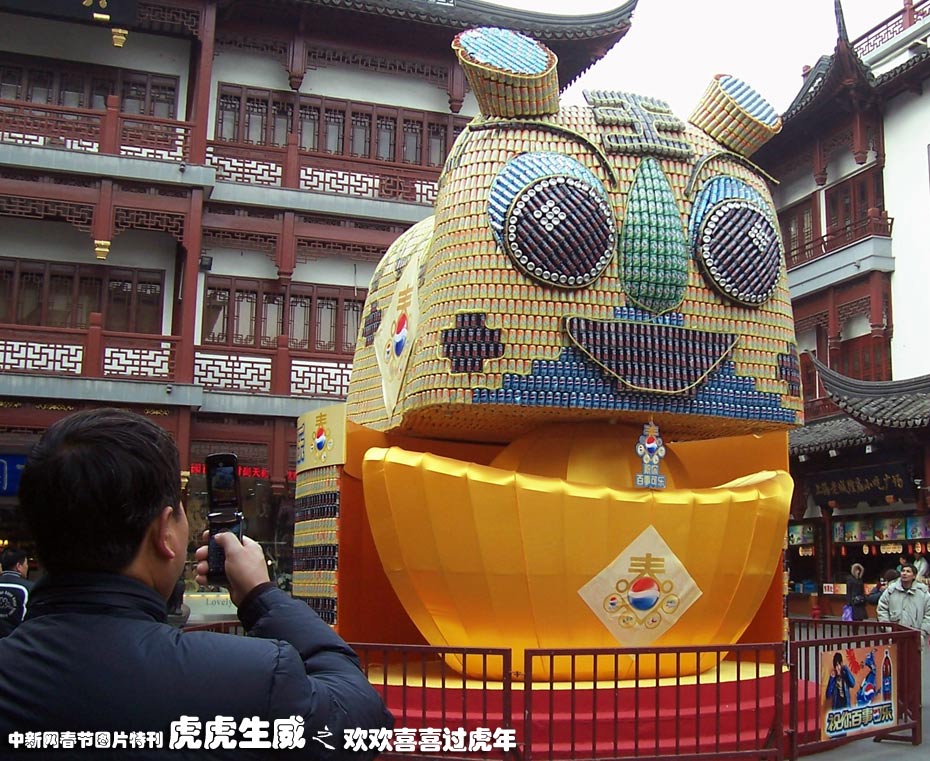 1月5日,一只用數(shù)萬個(gè)易拉罐搭成的高達(dá)七米的卡通虎亮相上海豫園商城廣場(chǎng),迎接虎年新春的到來,吸引中外游客觀賞留影。中新社發(fā) 周東潮 攝
