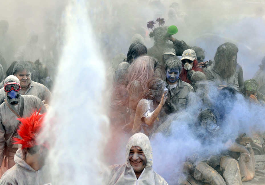 2月15日,希臘港口加拉西迪,狂歡者在街頭參加“面粉大戰(zhàn)”!懊娣鄞髴(zhàn)”是當(dāng)?shù)貞c?駳g季結(jié)束的一項(xiàng)傳統(tǒng)活動(dòng),隨后將是為期40天的齋戒月直至復(fù)活節(jié)。圖片來源:中國新聞網(wǎng)