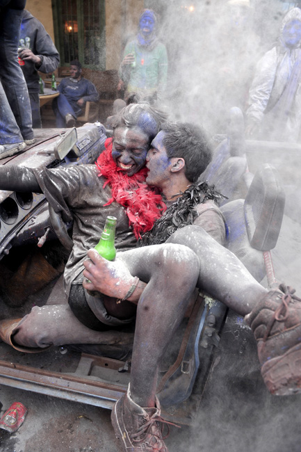 2月15日,希臘港口加拉西迪,狂歡者在街頭參加“面粉大戰(zhàn)”!懊娣鄞髴(zhàn)”是當(dāng)?shù)貞c?駳g季結(jié)束的一項傳統(tǒng)活動,隨后將是為期40天的齋戒月直至復(fù)活節(jié)。圖片來源:中國新聞網(wǎng)