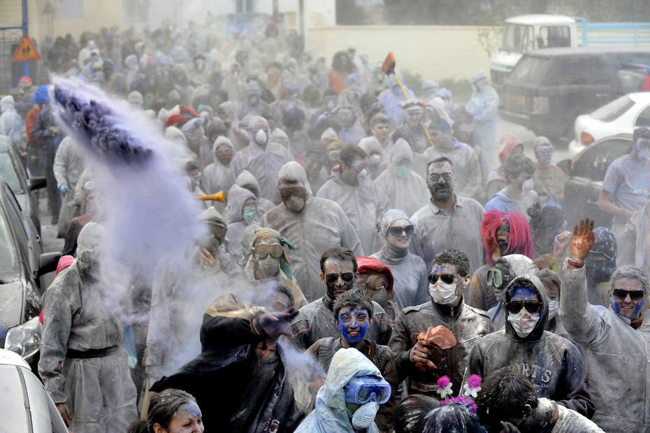 2月15日,希臘港口加拉西迪,狂歡者在街頭參加“面粉大戰(zhàn)”!懊娣鄞髴(zhàn)”是當(dāng)?shù)貞c祝狂歡季結(jié)束的一項(xiàng)傳統(tǒng)活動(dòng),隨后將是為期40天的齋戒月直至復(fù)活節(jié)。圖片來源:中國新聞網(wǎng)