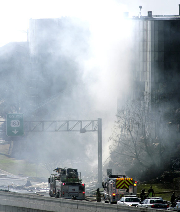一架低空飛行的小型飛機(jī)18日撞入德克薩斯州奧斯汀市國(guó)稅局的辦公大樓,當(dāng)?shù)毓賳T表示這可能是一件蓄謀事件。圖片來(lái)源:中國(guó)新聞網(wǎng)