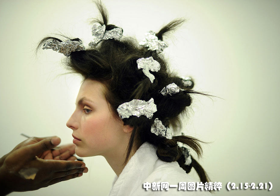 2月17日(周三),一個(gè)模特在2010年紐約秋季時(shí)裝周后臺(tái)化妝。