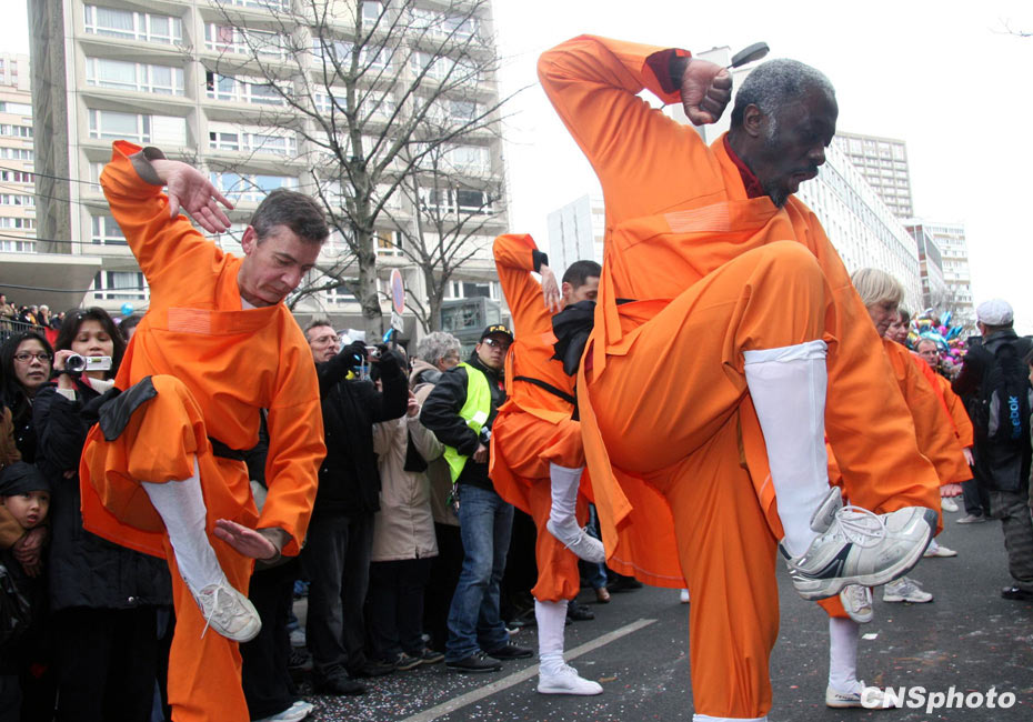 法國巴黎著名的“唐人街”——十三區(qū)21日下午舉行虎年春節(jié)華人嘉年華大游行,給這個有著顯著中國傳統(tǒng)文化特色的華人聚居區(qū)帶來了歡樂與喜氣。圖為洋武僧方陣表演中國功夫。中新社發(fā) 吳衛(wèi)中 攝
