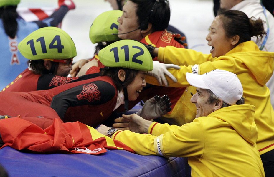 當(dāng)?shù)貢r(shí)間2月24日,溫哥華冬奧會(huì)女子短道速滑3000米接力A組決賽中,中國(guó)隊(duì)王濛、周洋、孫琳琳、張會(huì)四朵金花聯(lián)袂出擊,最終將金牌歸入中國(guó)隊(duì)囊中。圖片來(lái)源:中國(guó)新聞網(wǎng)