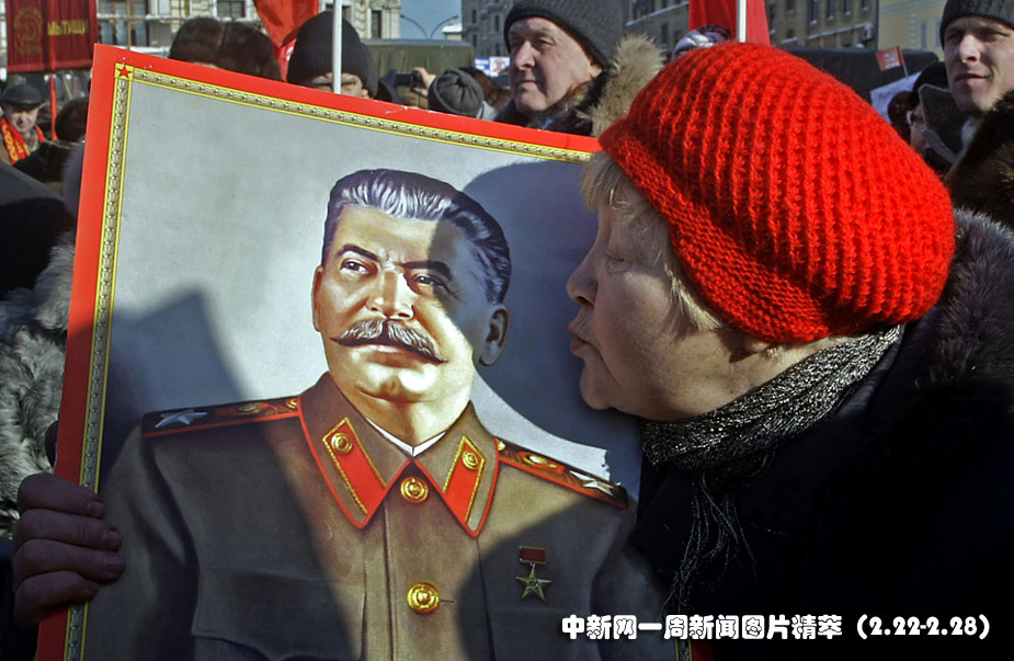 23日(周二)為慶祝俄羅斯祖國(guó)保衛(wèi)者日,共產(chǎn)黨員在莫斯科進(jìn)行了大游行。一位女士在游行中親吻斯大林的畫(huà)像。