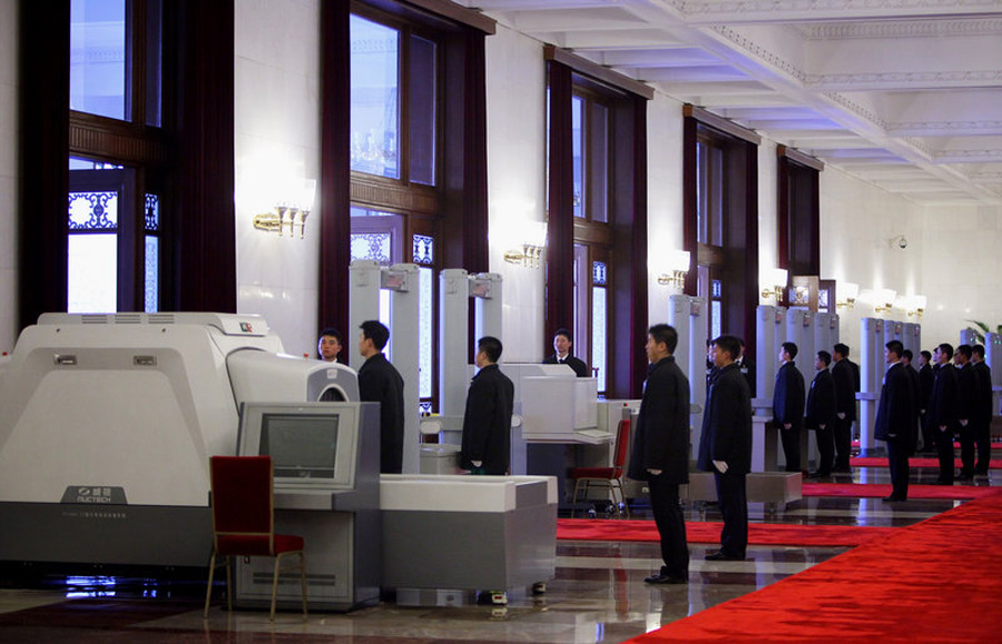 3日下午,全國政協(xié)十一屆三次會議將在北京人民大會堂開幕,2010年全國“兩會”由此正式揭開大幕,目前各項工作準(zhǔn)備就緒。圖為人民大會堂的主要入口處的安保人員。Feng Li 攝