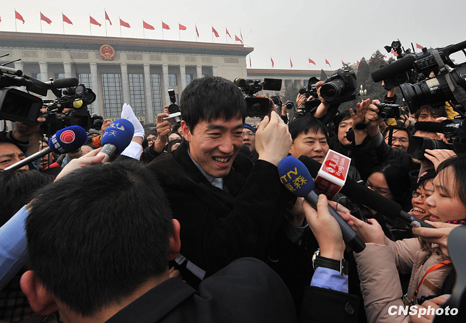 3月3日下午,政協(xié)委員劉翔出席全國政協(xié)十一屆三次會議開幕式,在北京人民大會堂外被媒體重重包圍,艱難脫身。中新社發(fā) 賈國榮 攝