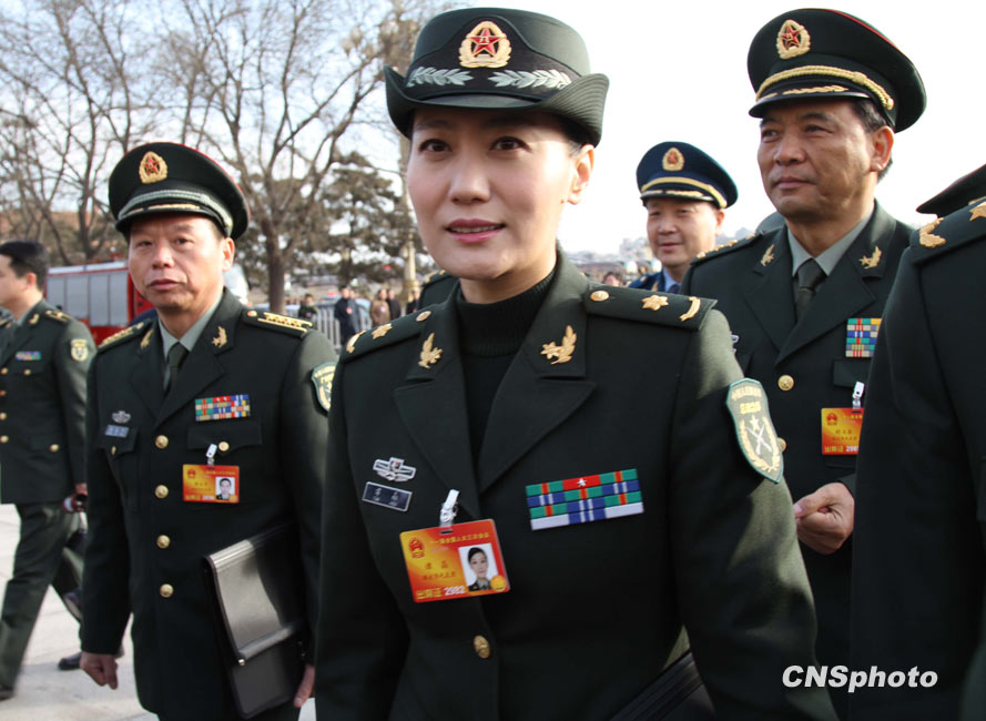 3月5日上午9時,十一屆全國人大三次會議在北京隆重開幕。國務院總理溫家寶作政府工作報告。圖為來自解放軍代表團的青年歌唱家譚晶步入會場。中新社發(fā) 韓蘇原 攝