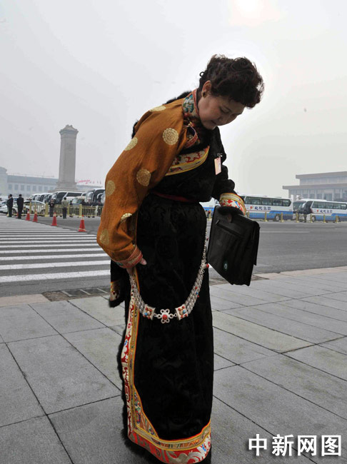 十一屆全國人大三次會議3月5日在北京開幕,各民族人大女代表的服飾靚麗多彩,在天安門廣場前大展英姿。 中新社記者 賈國榮 攝