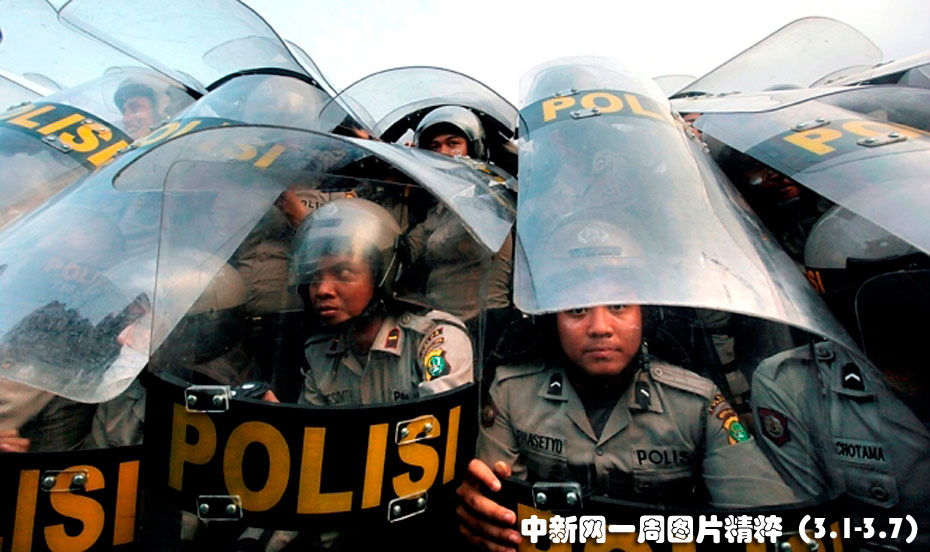 3月3日,印度尼西亞首都雅加達(dá)國會(huì)門外,警察用盾牌保護(hù)自己免受反政府示威者投擲的石塊的傷害。圖片來源:中國新聞網(wǎng)