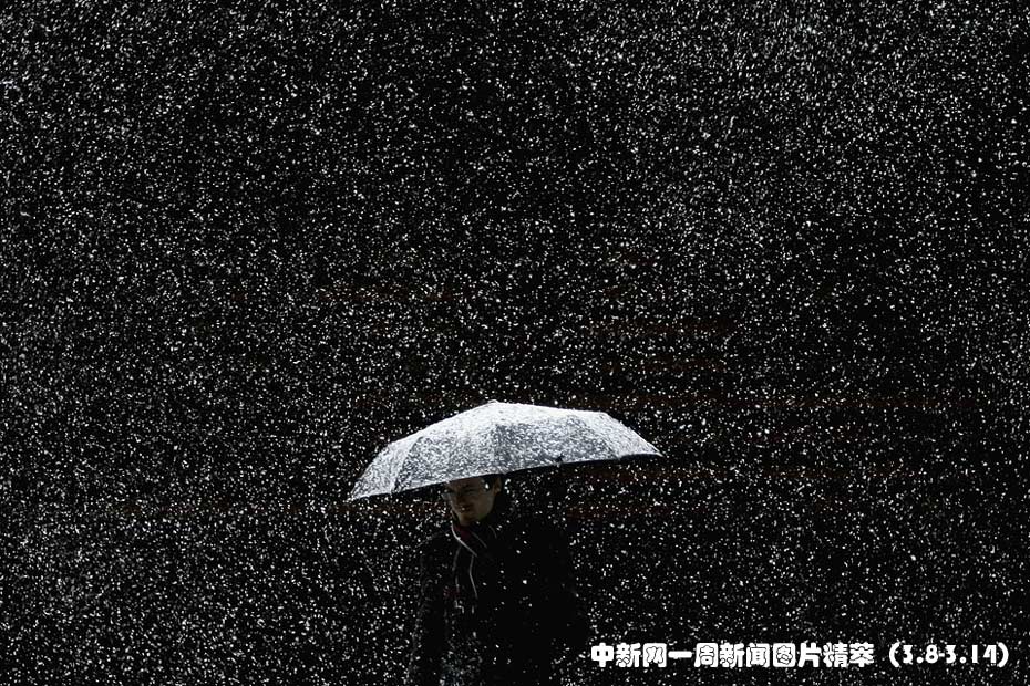 周一,一名男子打著雨傘走在下著大雪的西班牙巴塞羅那街頭。圖片來(lái)源:中國(guó)新聞網(wǎng)