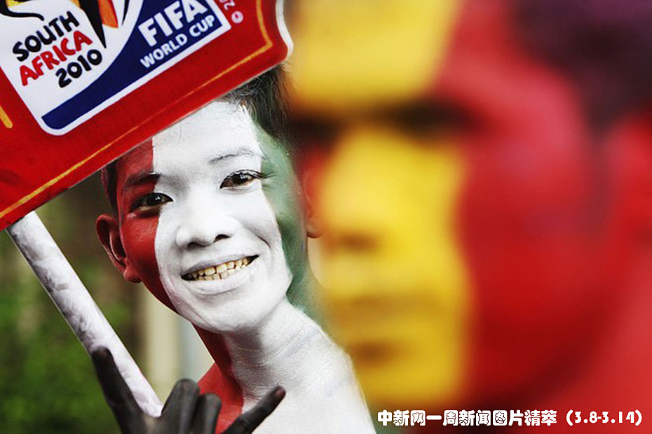 周一在印尼雅加達舉行的FIFA世界杯足球賽宣傳活動上,人們在身上涂上了參賽國家的國旗。圖片來源:中國新聞網(wǎng)