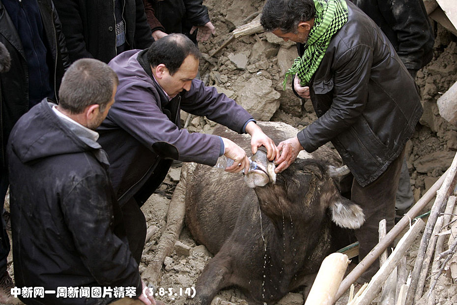 周二在土耳其奧克丘拉爾,人們試圖解救一頭被困在廢墟中的牛。土耳其此前一天發(fā)生的強烈地震造成至少50人遇難。圖片來源:中國新聞網