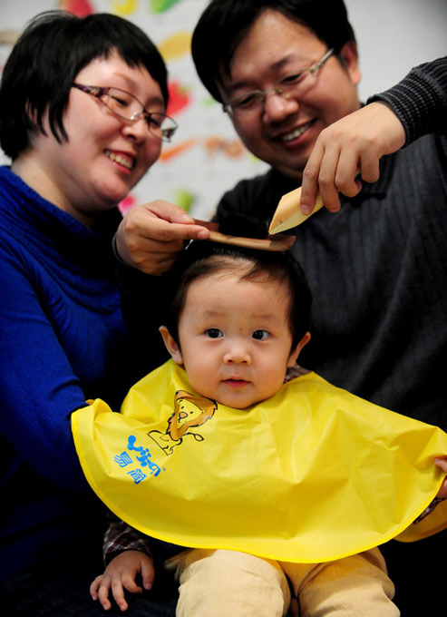 沈陽一周歲的小寶寶王梓旭正在“剪龍頭”。紅帆 攝