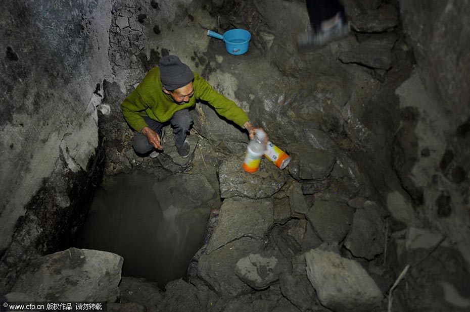 3月18日,貴州省息烽縣流長鄉(xiāng)新中村村民在從沒有干得如此嚴重的深井里取水。 吳東俊/CFP