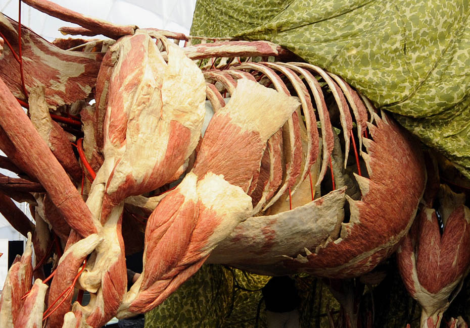 德國著名解剖學(xué)家鞏特爾·馮·哈根斯博士被稱為“死亡先生”,目前展出的是有史以來的最大的動(dòng)物尸體。體型巨大的“桑芭”尸體高3.5米,重3.2噸。據(jù)悉“桑芭”將于2010年4月歸還諾因基興動(dòng)物園。圖片來源:中國新聞網(wǎng)