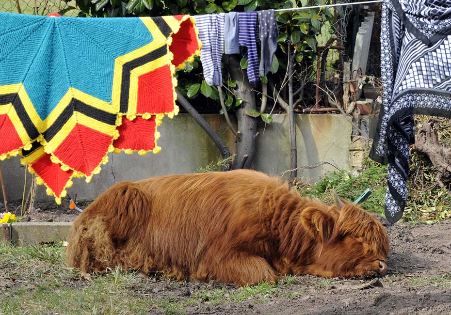 3月18日,德國(guó)一頭蘇格蘭高地牛來(lái)到一居民院內(nèi)懶洋洋的曬太陽(yáng),最后經(jīng)過(guò)獸醫(yī)的麻醉和消防員協(xié)力才將這頭蠻力十足的家伙“制服”。圖片來(lái)源:中國(guó)新聞網(wǎng)