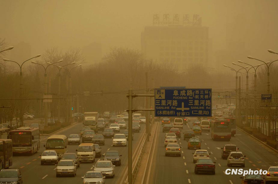 3月20日,春季首場(chǎng)重度浮塵天遮蓋了整個(gè)北京城。圖為北京馬路上空浮塵嚴(yán)重,帶來交通不便。中新社發(fā) 鄒憲 攝