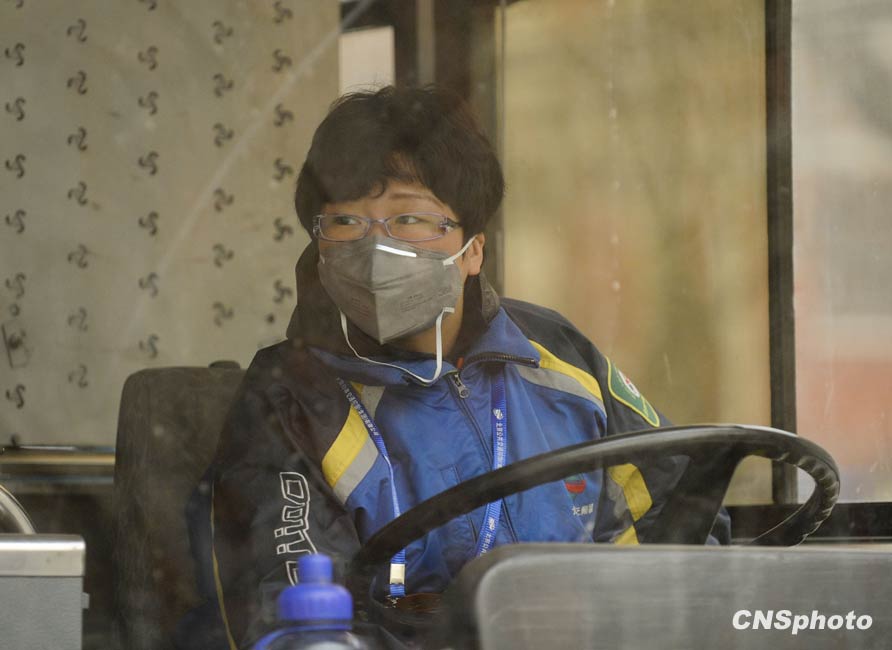 3月20日,春季首場重度浮塵天遮蓋了整個北京城。圖為一位公交車司機戴上防塵口罩。中新社發(fā) 廖攀 攝