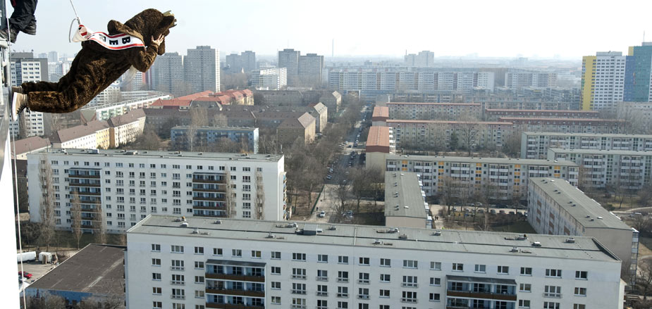 3月18日,在德國柏林舉行的“高樓漫步”活動中,一名女子打扮成熊的模樣(柏林的象征)在天使酒店外墻上行走,參加活動的人都有繩索保護(hù)。